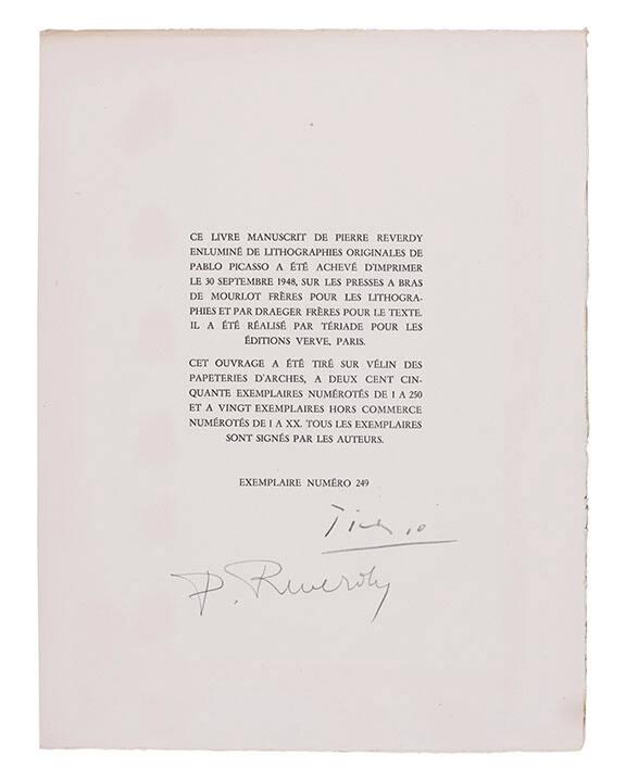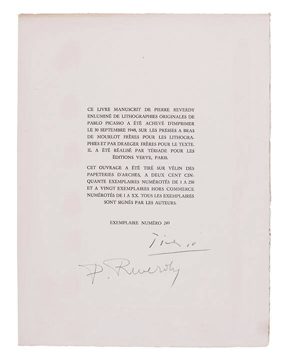 Label TextAlthough Picasso had known the Greek-born publisher Teriade for years throuh his associations with the noted art magazines 'Cahiers d'art', 'Minotaure', and 'Verve', LE CHANT DE MORTS was tobe their only illustrated book collaboreation. For this text, Picasso decided to creat a new type of illustration. Similar in principle to medieval illuminated manuscripts, Picasso made large calligraphic strokes, printed in vibrant orange, to interact with the black hand-written text on each page. Themarkings thus endowed the pages with a ritual quality.Published Referencescf. Castleman, Riva, A Century of Artists Books, New York, 1994, pp. 129 cf. Strachan, W. J., The Artist and the Book in France; The 20th Century livre d'artiste, New York, 1969, p. 340 cf. Johnson, Robert Flynn, Artists' Books in the Modern Era 1870--2000: The Reva and David Logan Collection of Illustrated Books, San Francisco, 2001, no. 70