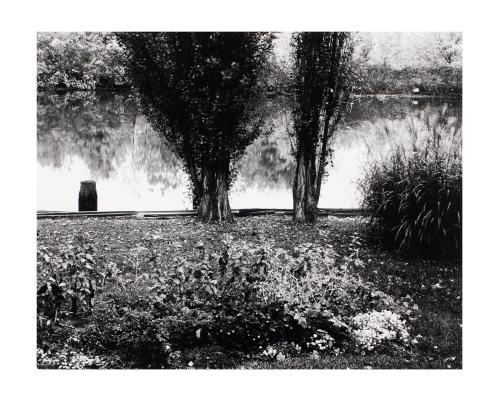 DescriptionView of garden, with two trees and pond (or river?) beyond.