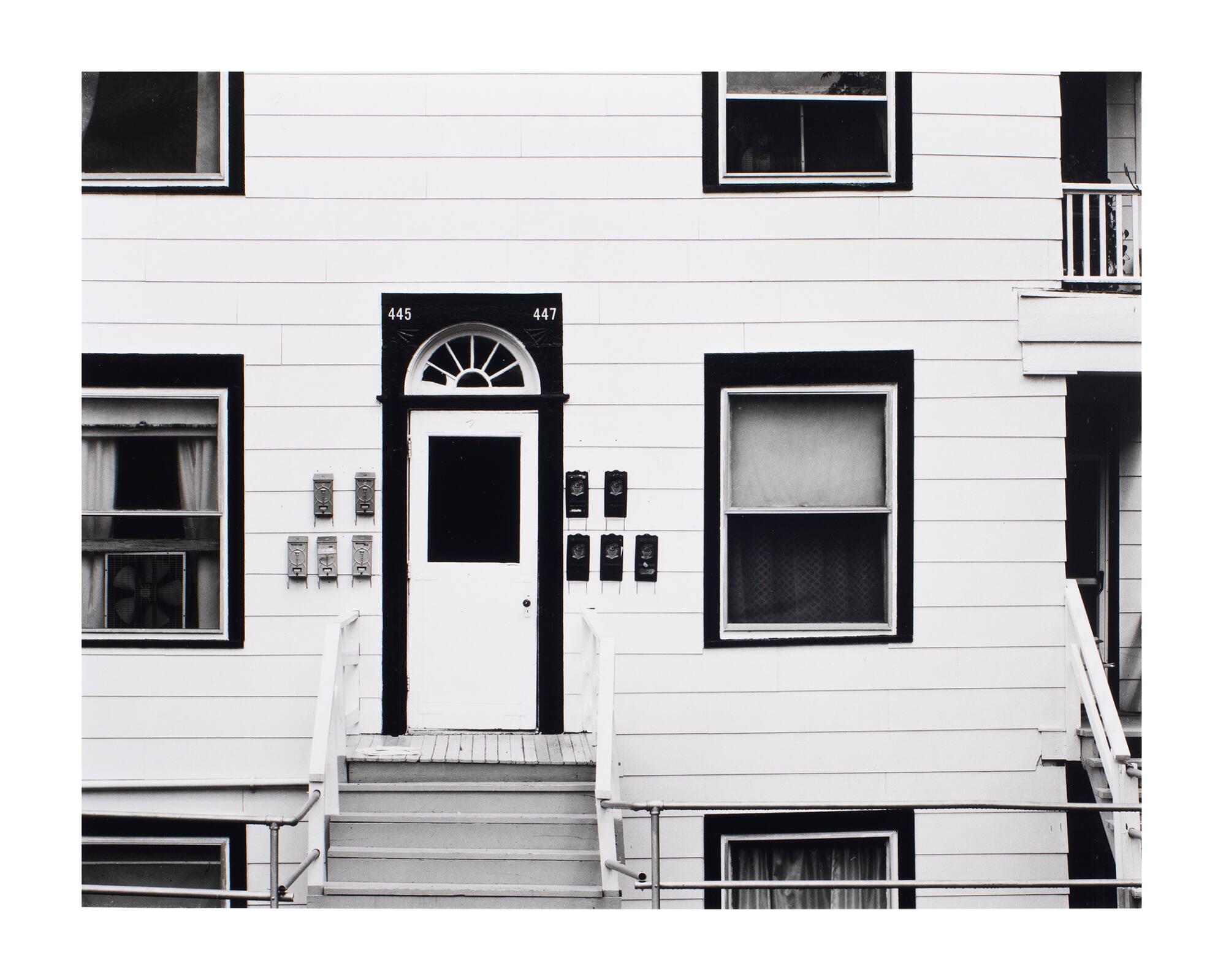 DescriptionClose-up view of doorway flanked by 5 mailboxes on each side and capped by address, numbers "445" and "447."