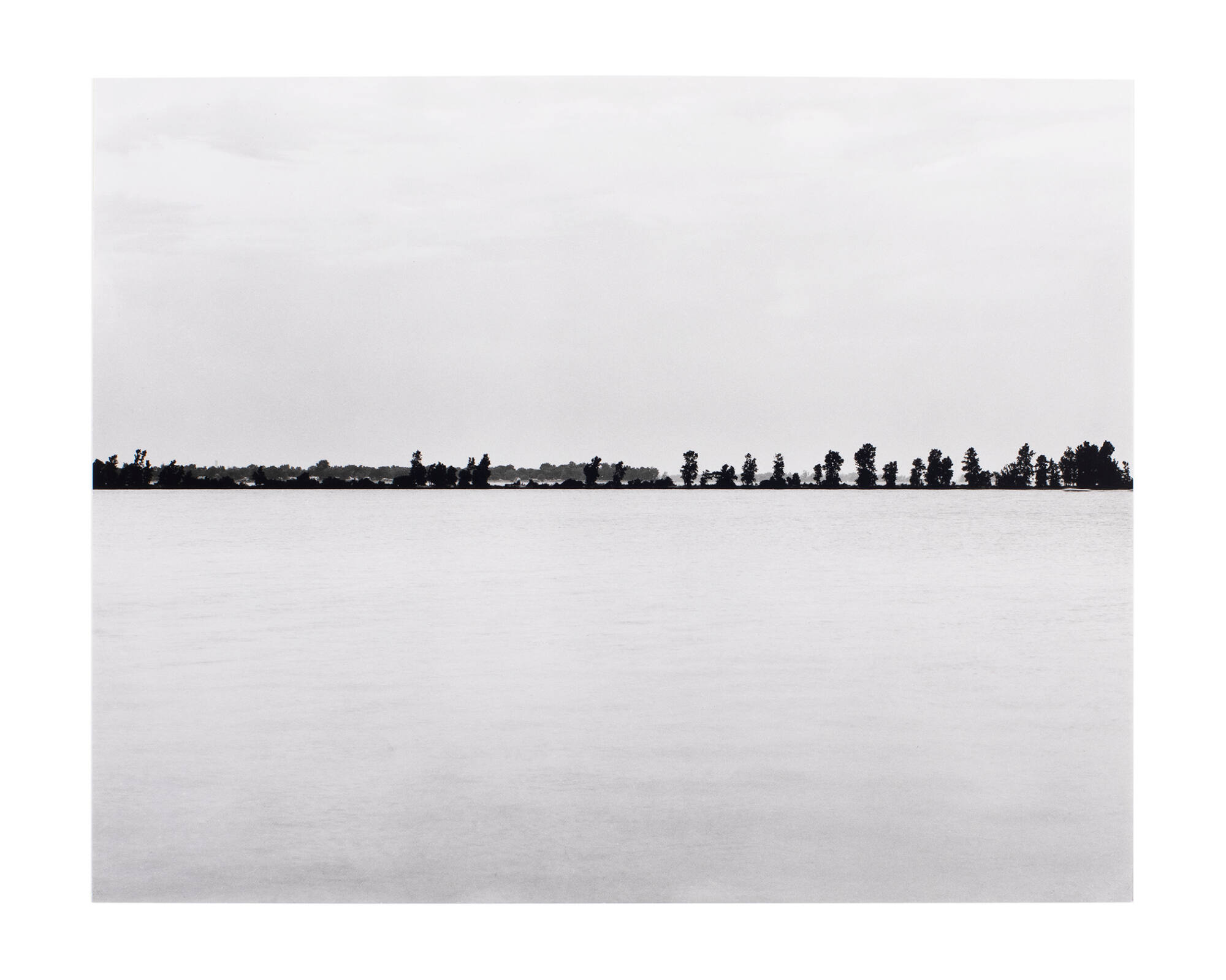 DescriptionRiver view with expanse of water and strip of land with row of trees.