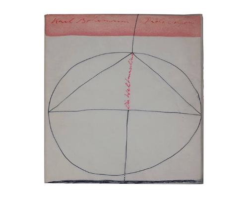 MediumOriginal drawing: diagram drawn in black ink on the front wrapper, with text handwritten in red; field of red wash on the front board of the binding showing through the translucent wrapper as part of the design.