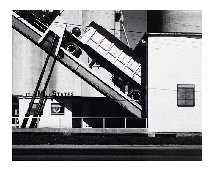 DescriptionView of truck on steeply-pitched incline "backing into" a grain elevator structure. Sign saing "M States" to left of center.