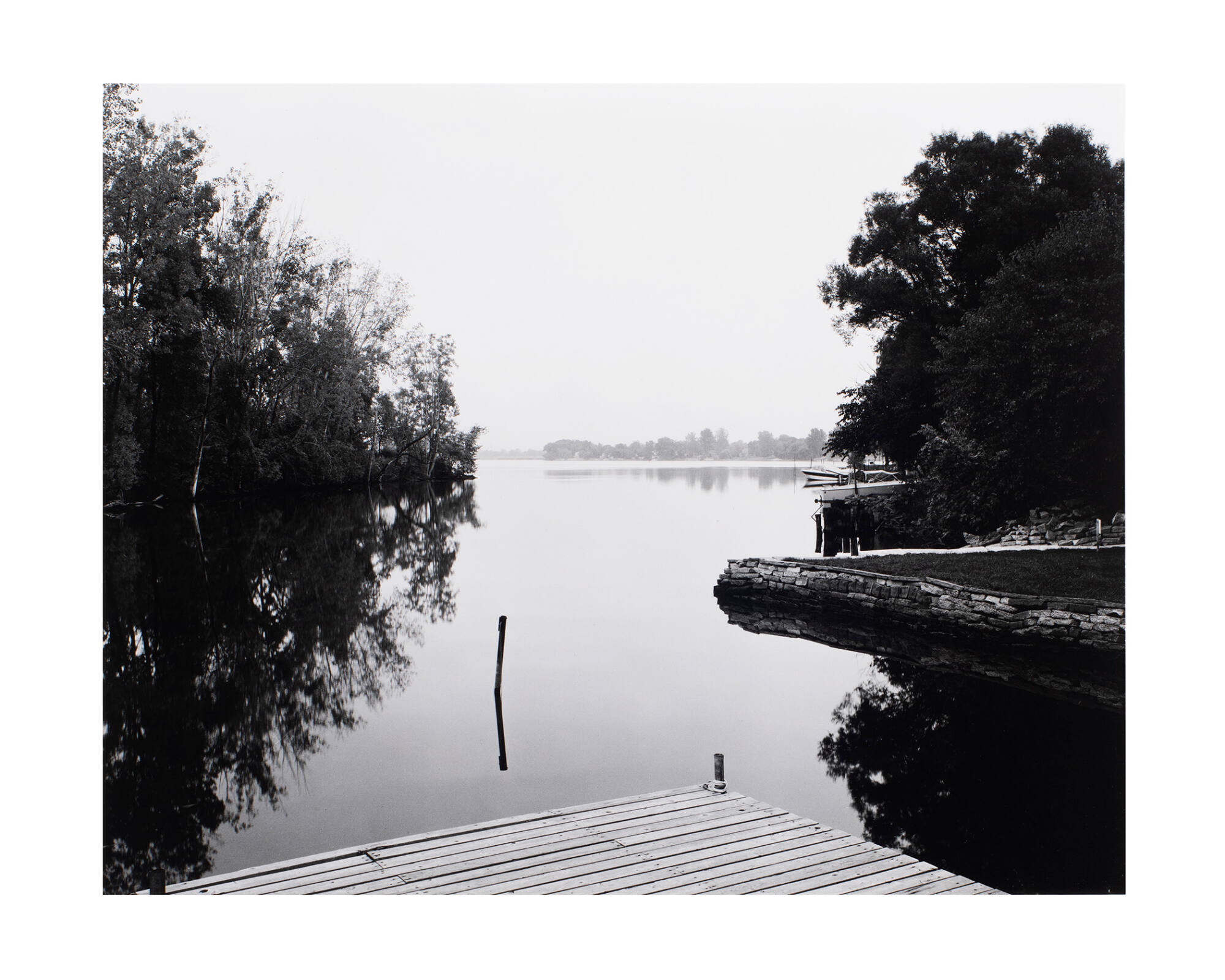 DescriptionView of river with triangular section of a dock in foreground. Moored boat near bank at center right.