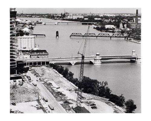 DescriptionAerial view of Maumee River just south of Cherry Street Bridge. Crane in central foreground; skyscraper under construction at left.