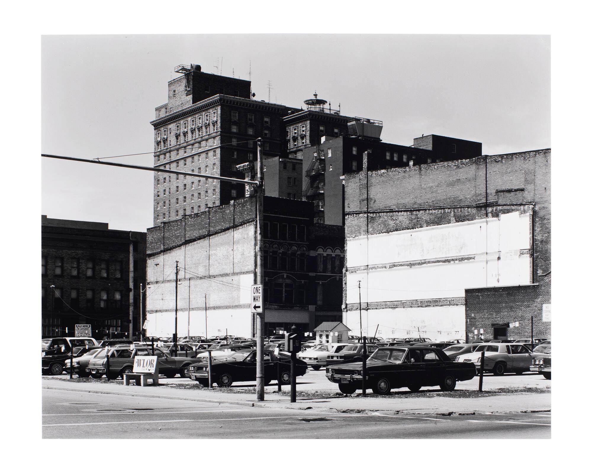 DescriptionView of parking lot and parked cars with city buildings in background. "One way" sign on pole, center, and "WLQR" sign on bench to left of center.