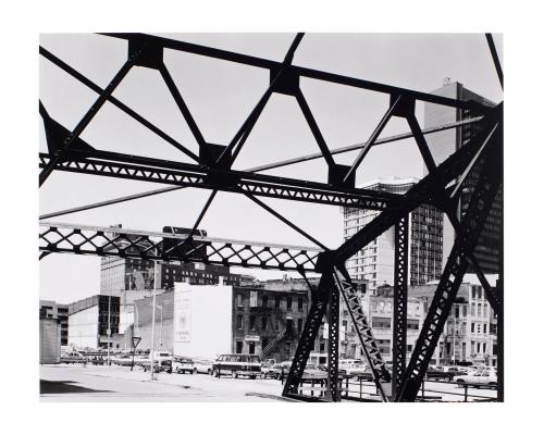DescriptionView of downtown city buildings seen through network of bridge girders. "Hardware" mural to left of center.
