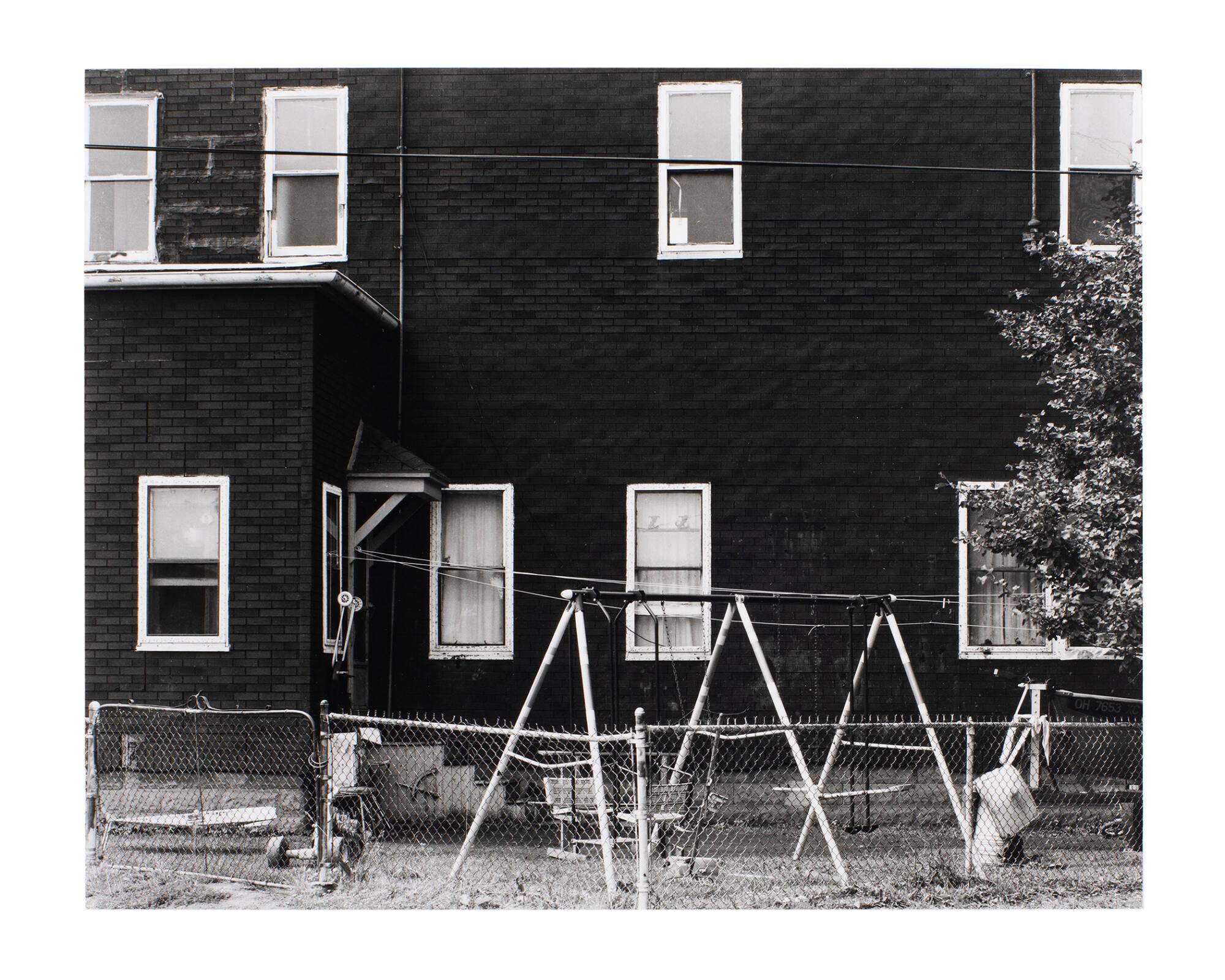 DescriptionBackyard with chain-link fence, swing set, clothes line, and side of house.