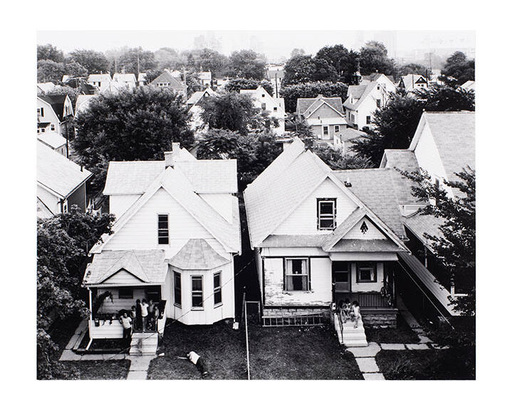 DescriptionAerial view of two houses, with families on front porches, and other houses and downtown skyscrapers in background (at top of image).