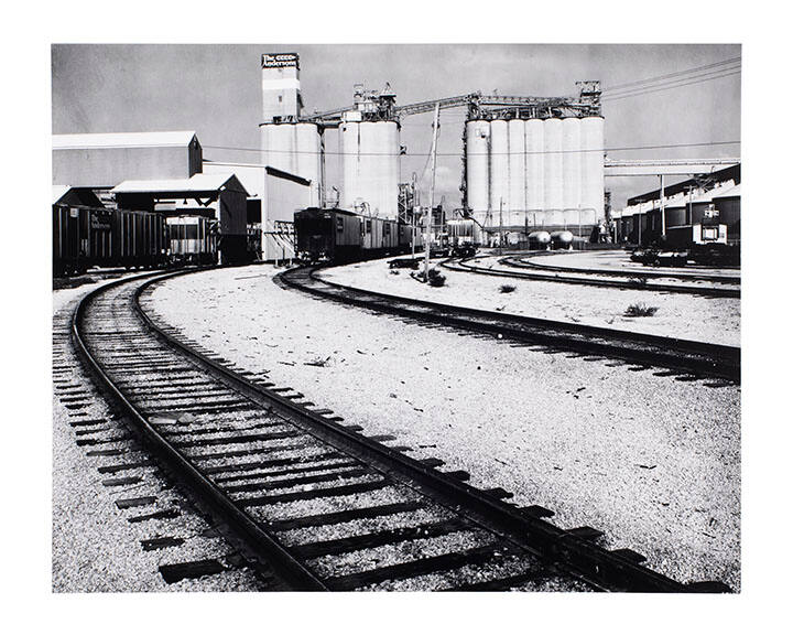 DescriptionRailroad tracks curving towards grain storage elevators topped by "The Andersons" sign.