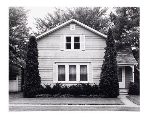 DescriptionView of shingled house, flanked by cone-shaped tree on each side, with doorway at far right.