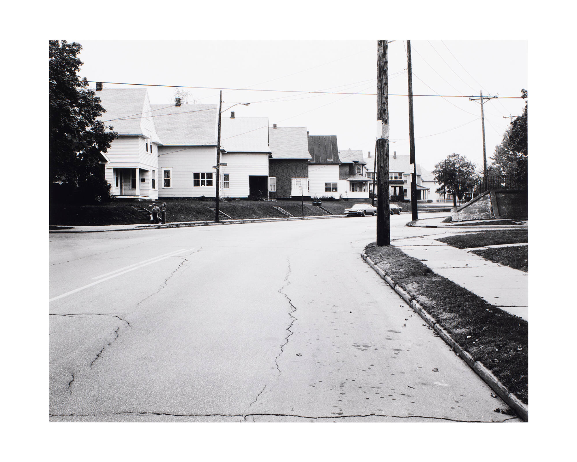 DescriptionStreet view with sidewalk and telephone poles on right; row of at least 7 houses on opposite side of street (in upper central portion of image).