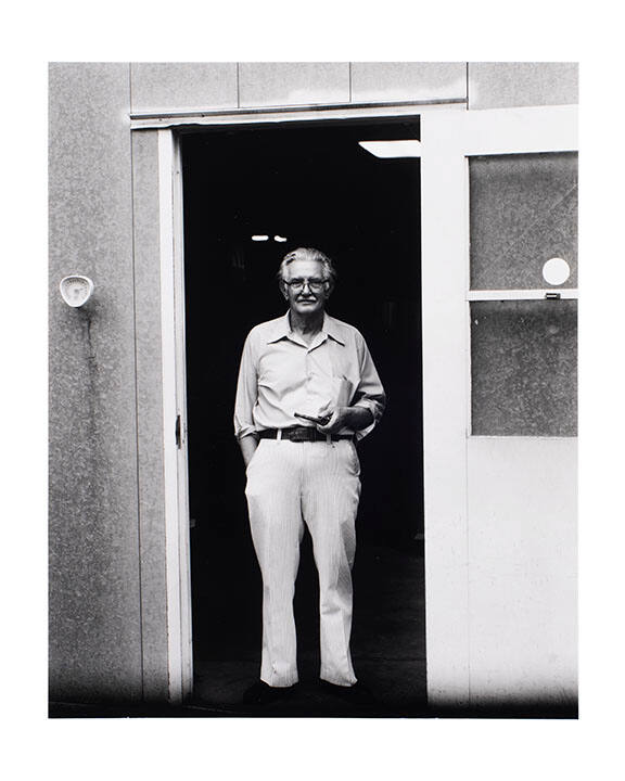 DescriptionMan, wearing light-colored shirt and striped trousers, standing in doorway.