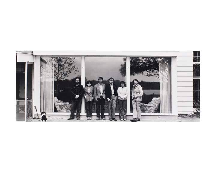 DescriptionPortrait of six adults (Stranahan family?), standing against large windows of a house. Back view of dog at lower left.