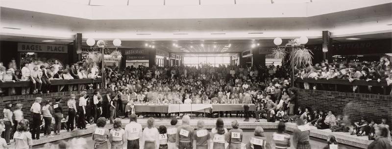 DescriptionIndoor shopping mall scene with a contest in progress: crowd of people in background; long table with seated "judges" in middle ground; in foreground, back view of standing teenagers each with numbered card attached to his/her shirt.