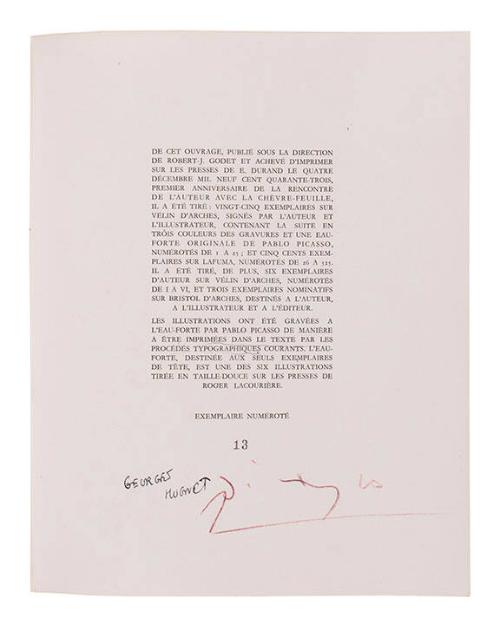 Exhibition HistoryToledo Museum of Art, Picasso as an Illustrator, 1988, no. 15Toledo Museum of Art, The Bareiss Collection of Illustrated Books from Toulouse-Lautrec to Kiefer, 1985, no. 63.
