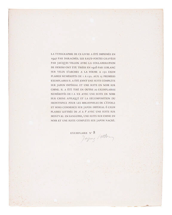 MediumOriginal prints: 11 etchings with aquatint (some in colors), incl. frontispiece and suite cover; plus 2 additional suites of 10 etchings each, 1 on buff Imperial Japan and 1 on white China laid paper. Text: letterpress in black with sanguine. Paper: Arches cream wove paper.