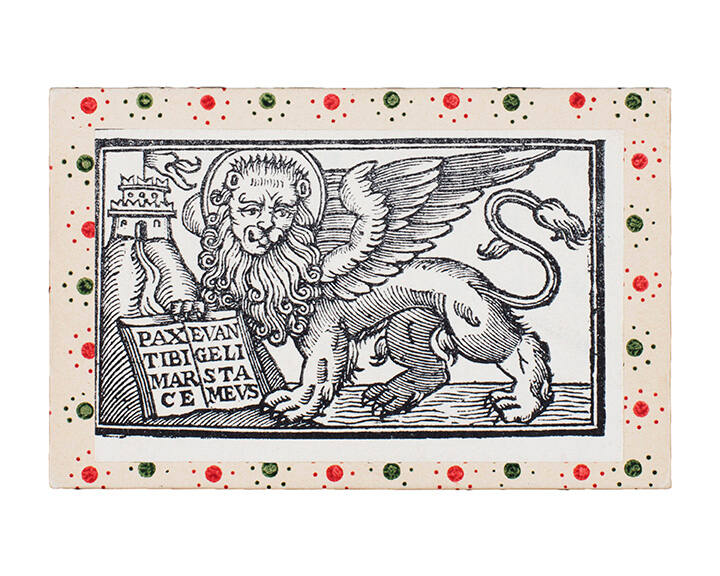 MediumOriginal prints: 23 line block reproductions of wood cuts from the original 17th Century blocks, hand stenciled in six colors on cream wove Fabriano paper.
