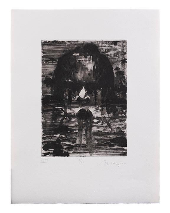 In this edition of fity portfolios, Mazur's etchings are printed on Arches Cover White with accompanying bilingual text on UV Ultra papers. They are encased in two red silk tri-fold portfolios at Harcourt Bindery, Boston, under the supervision of Samuel Ellenport, and are contained in a box created by Portfoliobox, Inc., Providence, Rhode Island. These are signed and numbered 1-50.