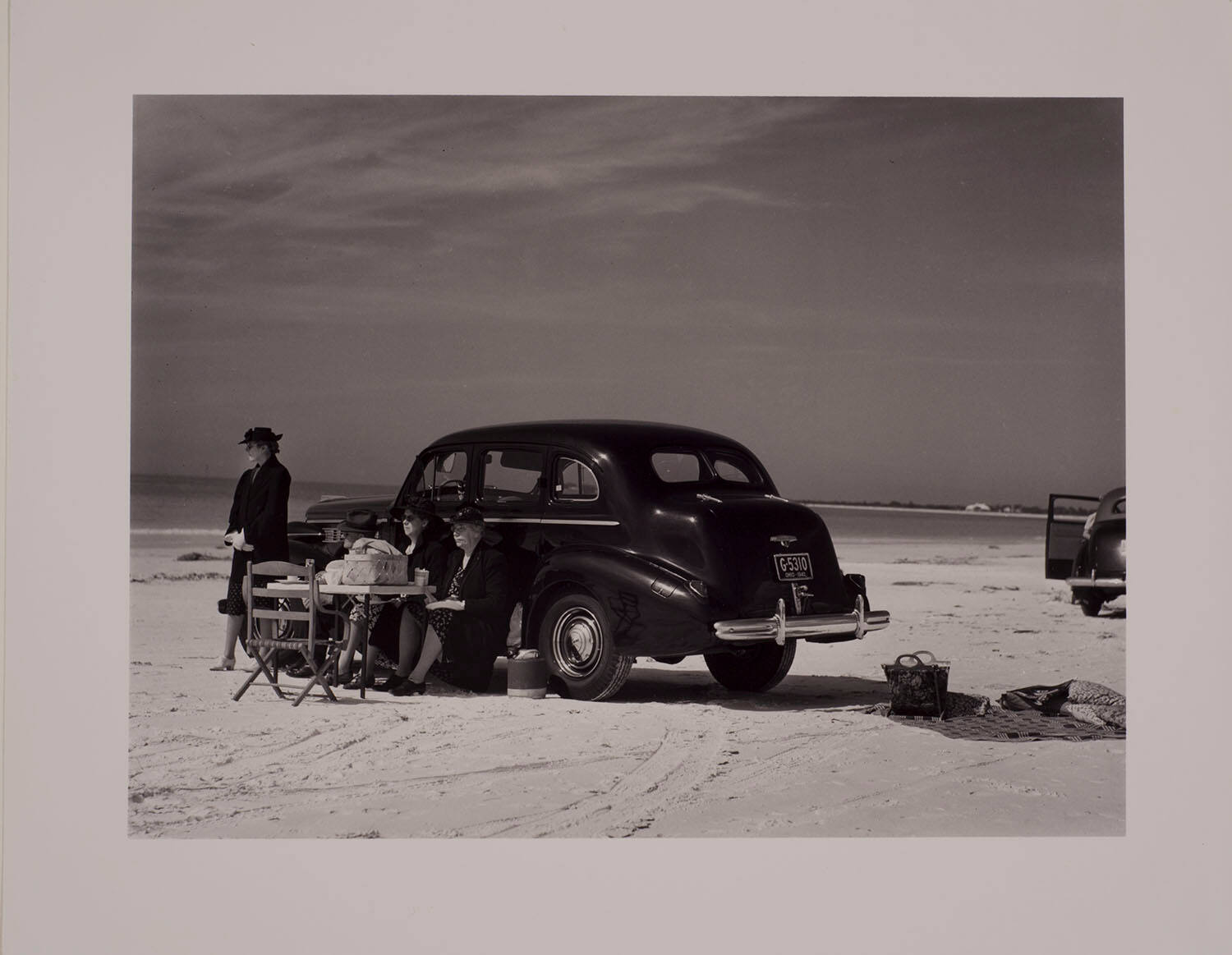 Winter Tourists Picnicking on Running Board of Car near Trailer Park, Sarasota, Florida