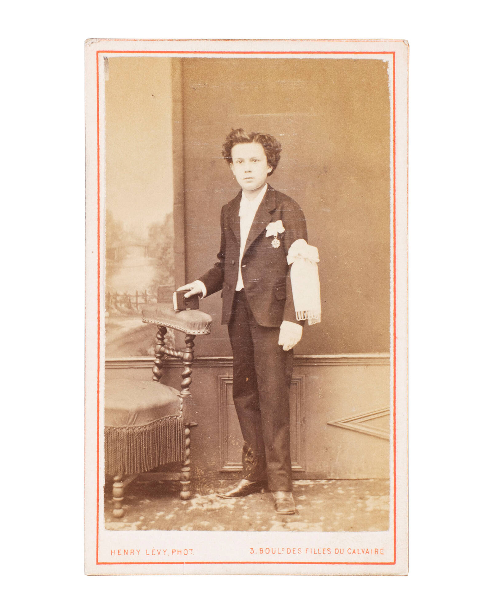 Untitled (portrait of a boy standing, with a scarf tied around his left arm)
