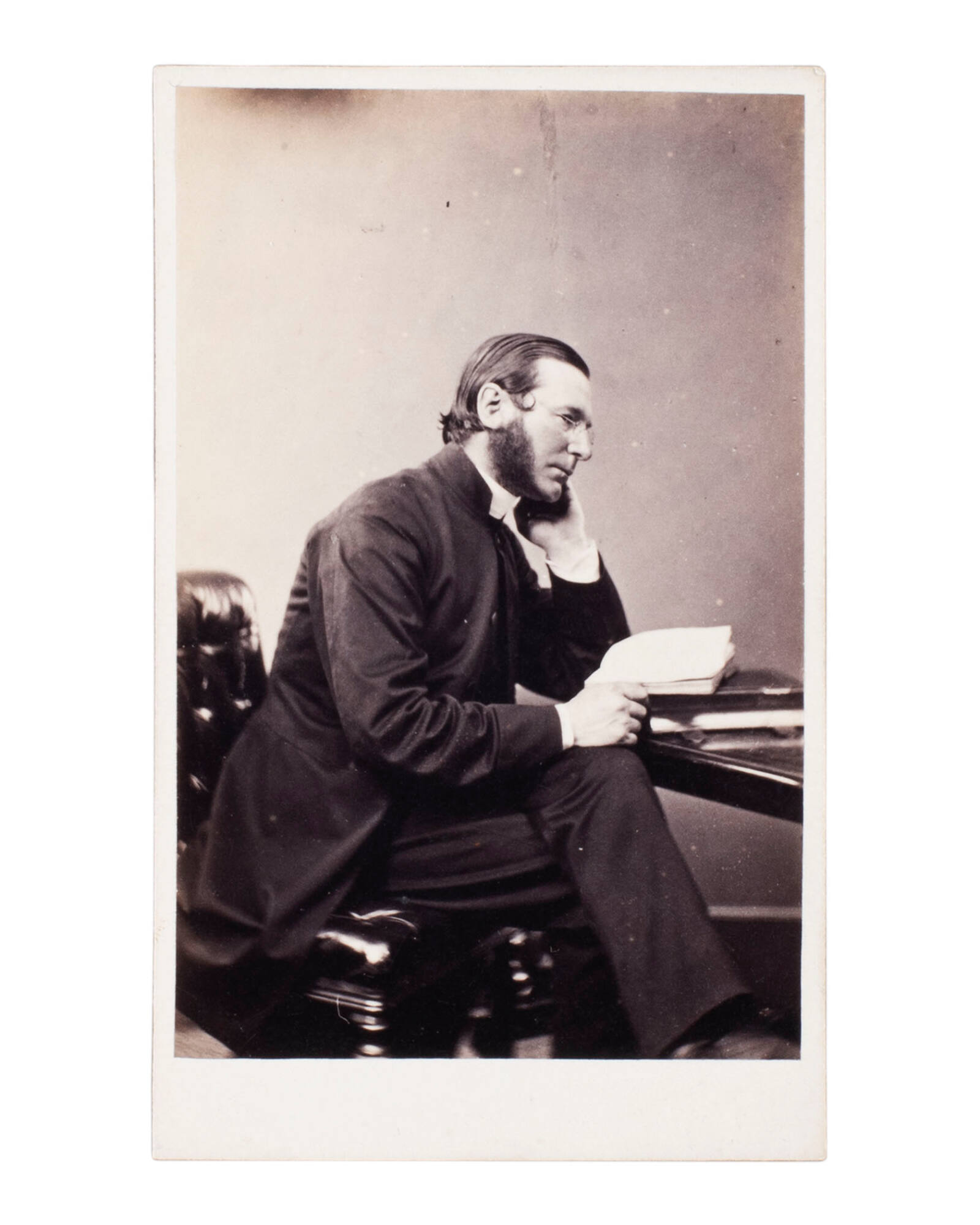 Untitled (Sideview of a bearded man sitting at a table, and reading a book)