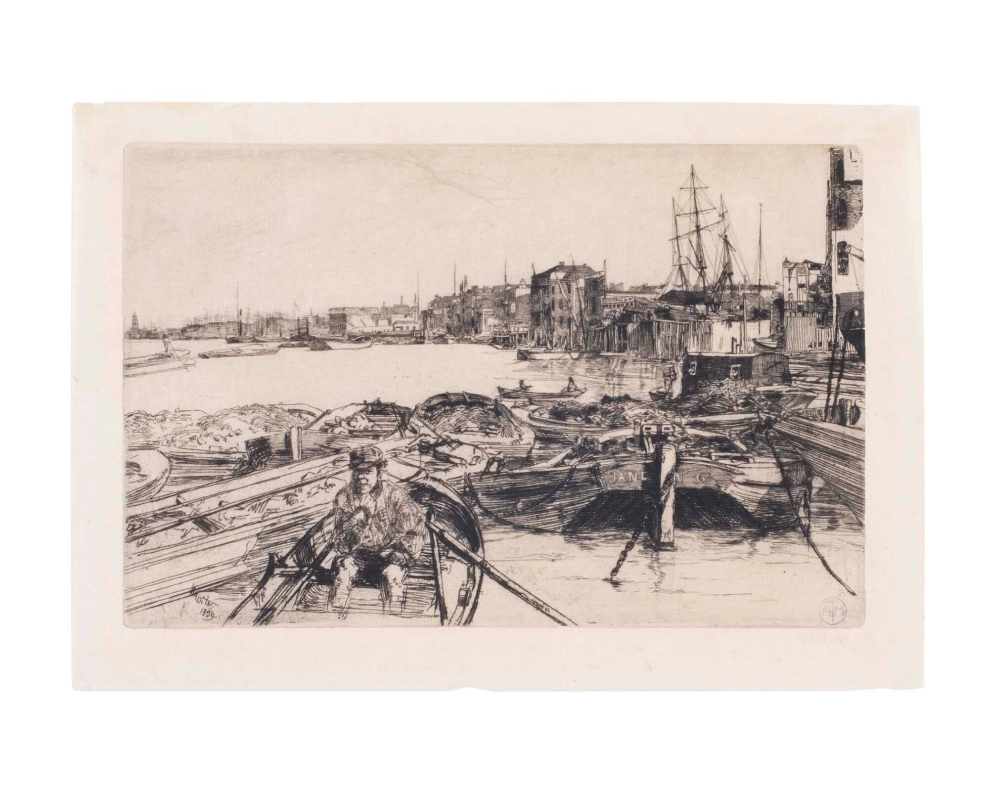 Label TextThe men who lived and worked along the Thames River, London, on boats and barges, docks and wharfs, in the area of Wapping and Limehouse became the subjects of a group of eight prints by Whistler. These prints were included in a set (the Thames Set) published in 1871. The workingmen and women are never idealized. They reflect the hard life of working class people in mid-19th-century London. “The workingmen of Wapping and their venue provided Whistler with a most appropriate realist subject: it was contemporary, it was working-class, it combined the elements of seascape and cityscape, and it was above all novel.”Exhibition HistoryTMA show, Sept 12 - Nov 9 - 1999. TMA, Whistler: Influences, Friends, and the Not-So-Friendly, Feb. 26 - May 30, 2010.Membership