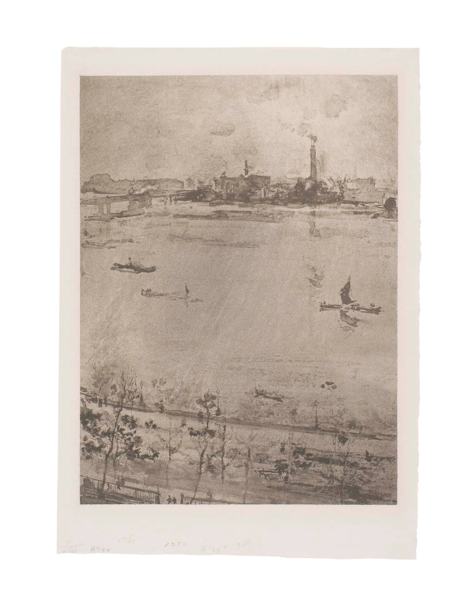 In 1912, T. R. Way, the master printer of Whistler’s lithotints (see prints by Way nearby), recalled that this particular print was drawn, “…from memory while Whistler sat in the printing offices of Wellington Street.” Whistler had painted the scene many times as it was the dominant view from his apartment windows. From those windows he saw the spire of Battersea Church, industrial slag heaps, the lighted clock tower of the Morgan Crucible Company, warehouses, and chimneys. Using the lithotint process (a printing technique that gives the appearance of a drawing made with ink washes), Whistler softened the hard-edged industrial landscape, finding beauty where others could not.