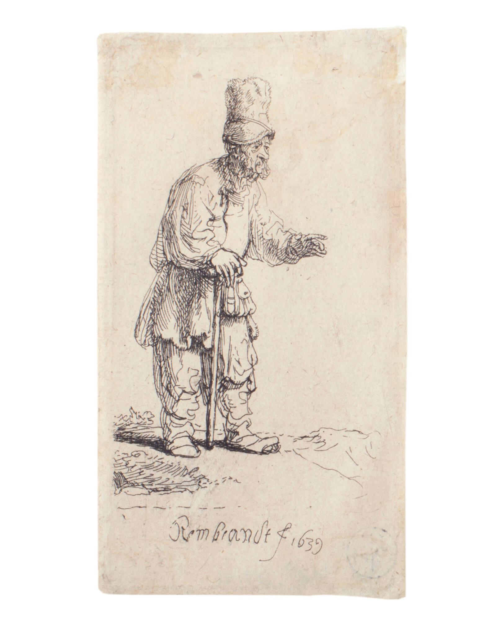 Peasant in High Cap, Standing leaning on a Stick (H. 164 only state, B. 133)