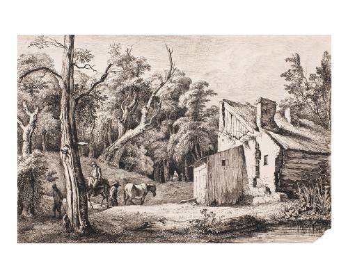 Entrèe de forêt avec masure à driote (Entrance to a forest with cottage at right)
