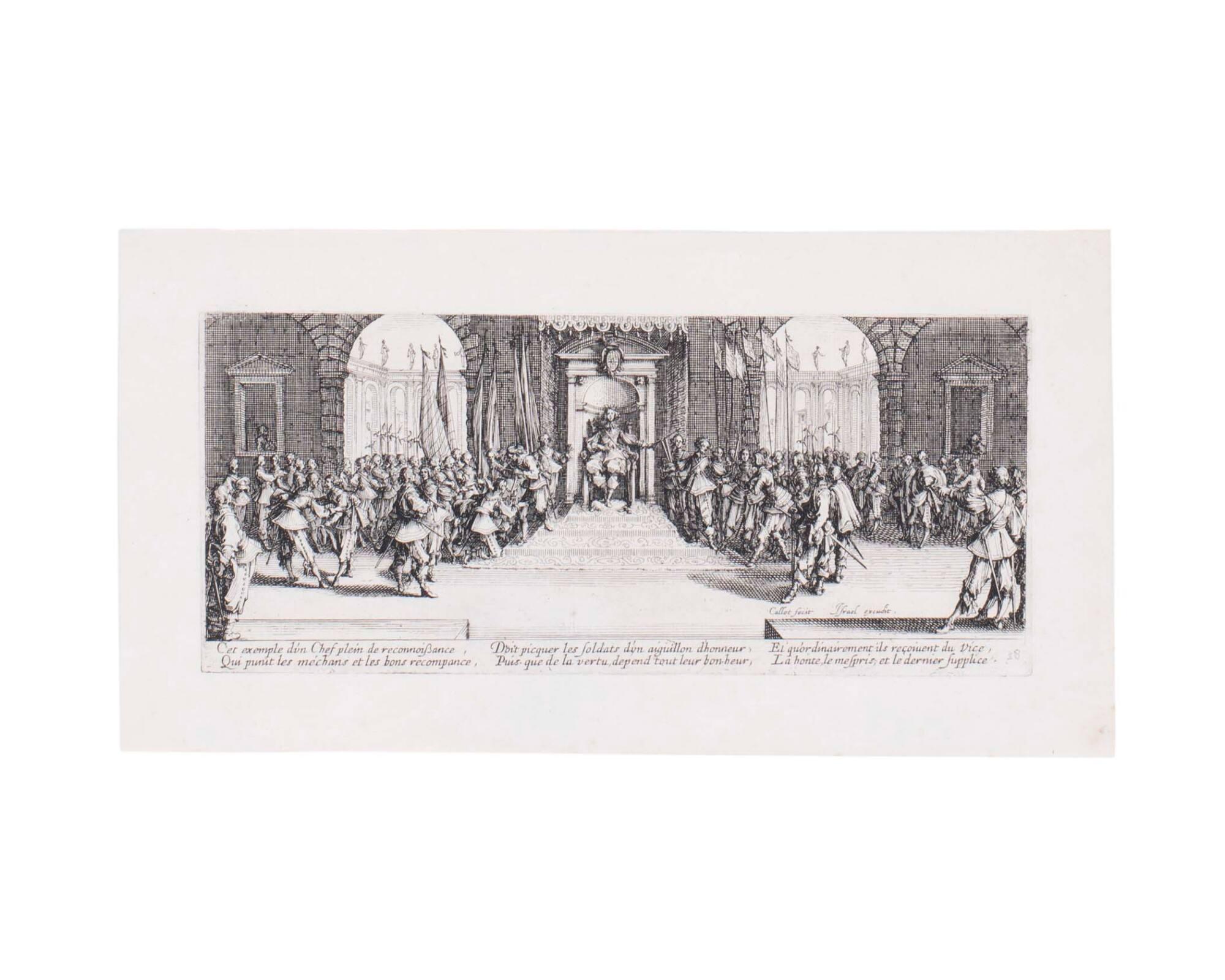 Label TextThis example of a grateful leader, who punishes evil and rewards the good, should prick soldiers with the goad of honor, since all their happiness depends on virtue and they ordinarily receive from vice shame, scorn and the extreme penalty.Published ReferencesSee 1982.130AExhibition HistoryTMA: Disasters of War, July 13 - October 21, 2001 TMA Recent Acquisitions: Prints, Drawings, & llustrated Books Jan. 22, - June 24, 1983. TMA, The Dramatic Image: Baroque Prints of the 17th Century, February 25 - July 31, 2011.