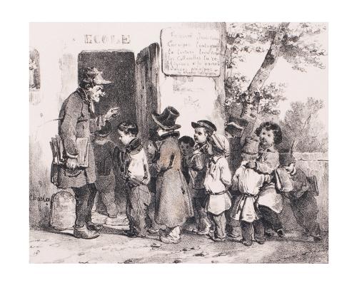 "E" (no. 5) "École. Commencement des misères et des tribulations de la vie." from "Alphabet. Moral et Philosophique, à l’usage des petits et des grands enfans"