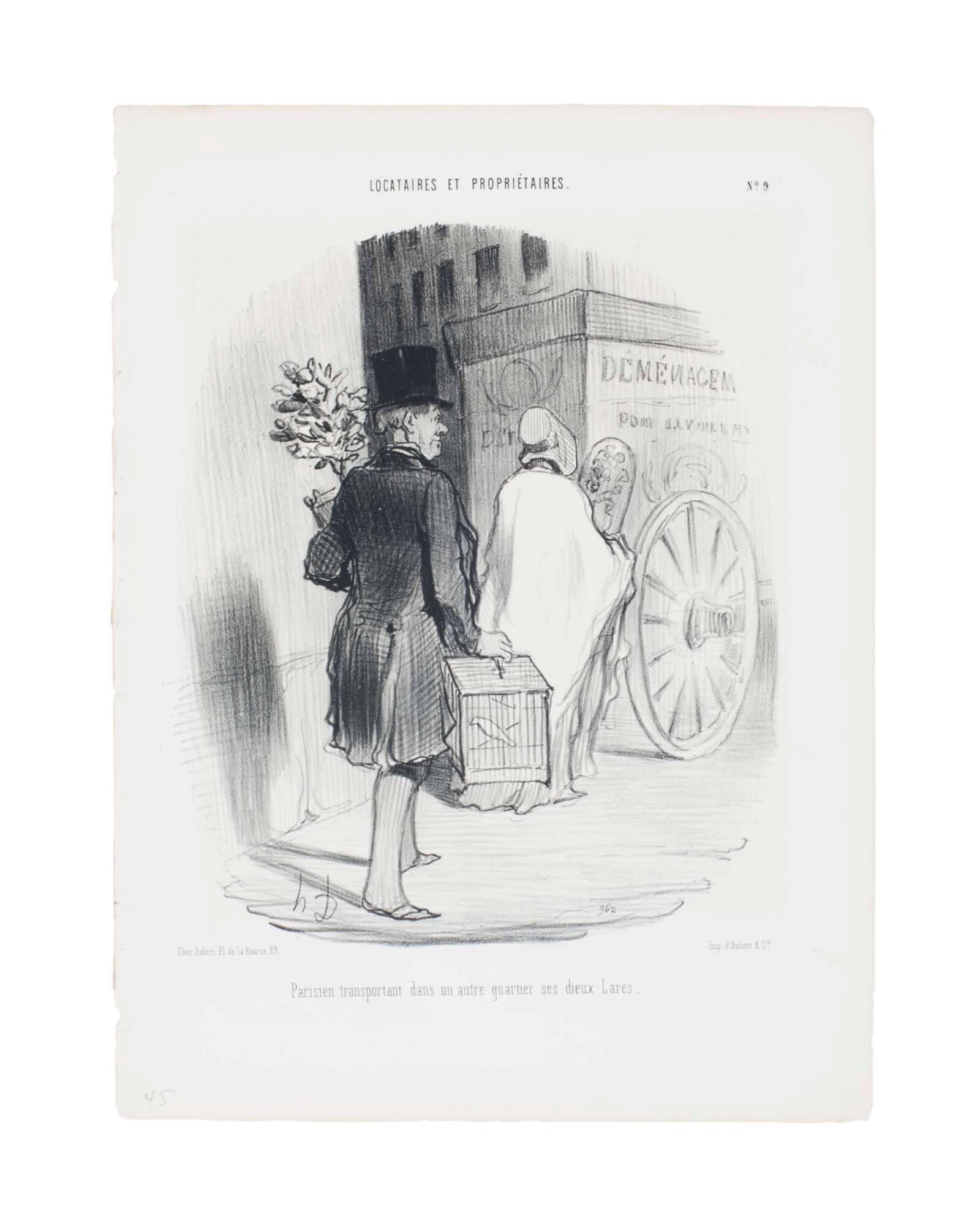Parisien transportant dans un autre quartier ses dieux Lares. From "Locataires et Propriétaires", no. 9