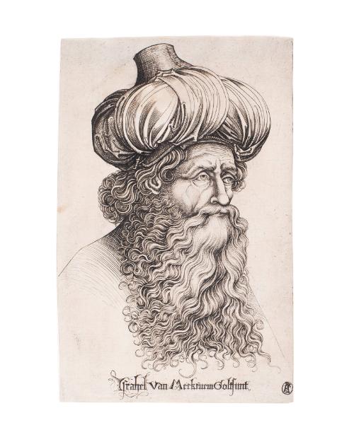 This is believed to be a self-portrait. Like most early engravers, Van Meckenem was trained as a goldsmith. He is also the first Northern Renaissance printmaker to sign his full name, rather than use initials or symbols. You can see the pride he took in his work by the spiky calligraphy of his name after which he declares his profession – goldsmith. Goldsmiths were considered the elite among craftsmen at the time.