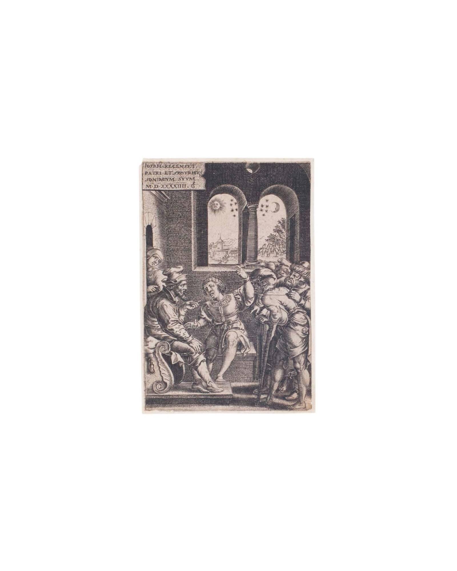 Label TextIn the biblical story, Joseph, the 11th son of Jacob and most beloved of his father, recounts his dreams to his brothers and father. In the first dream, he and his brothers gather together sheaves of grain. The sheaves gathered by his elders bow down to those gathered by Joseph. In a second dream, the sun (Jacob), the moon (Joseph’s mother, Rachel), and 11 stars (Joseph’s brothers) bow down to Joseph himself. According to the Book of Genesis, the jealousy of his brothers led to them imprisoning Joseph in a dry well and then selling him into slavery in Egypt, where he eventually becomes a powerful official to the pharaoh (fulfilling his dreams’ prophecies). These prints are reverse copies by an unknown artist after the originals by Georg Pencz.Exhibition HistoryTMA, Storytelling in Miniature, October 7, 2011-March 4, 2012.Membership