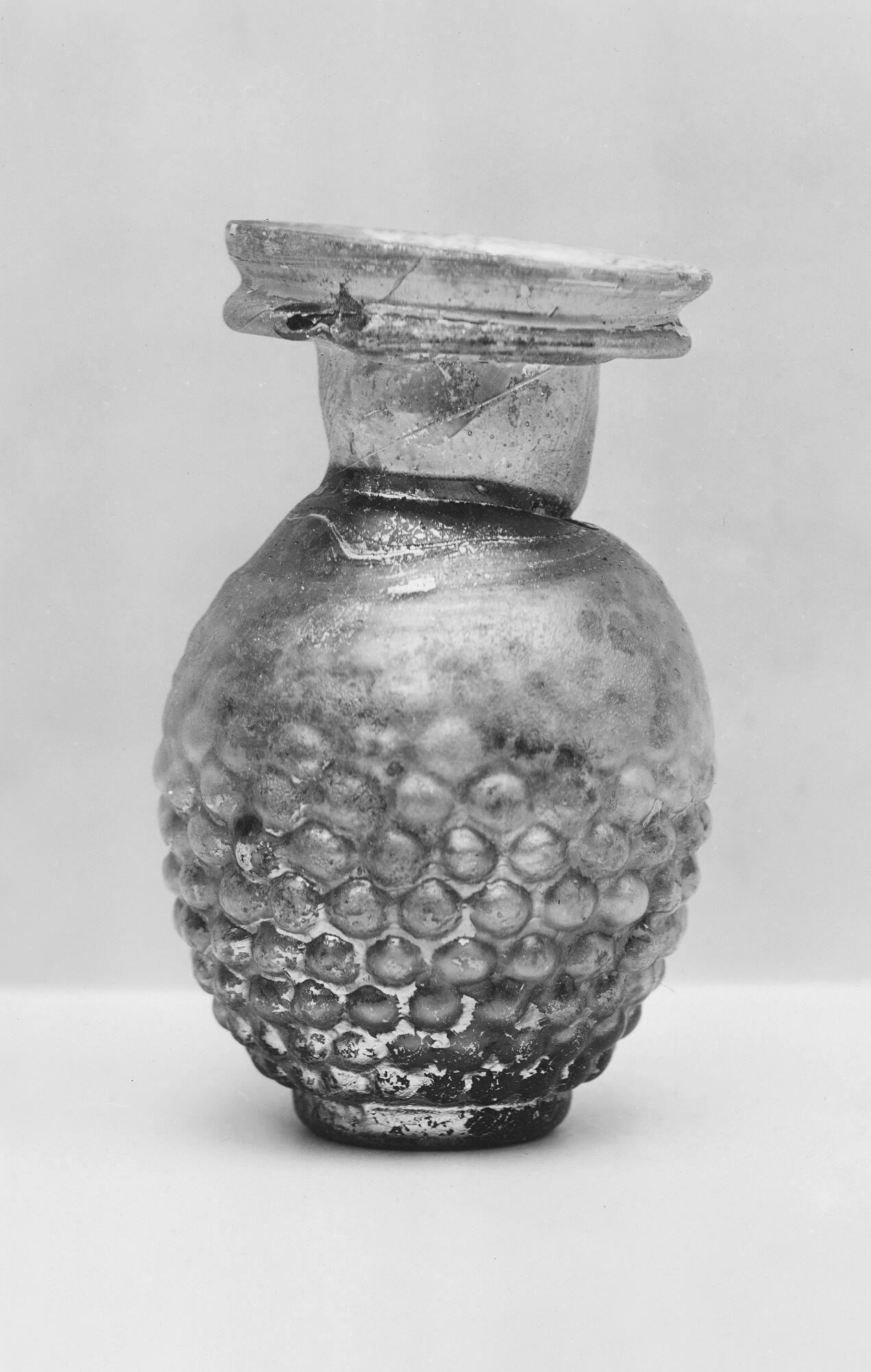 DescriptionThis vessel is made of translucent to transparent grayish yellow-green glass (near 5 GY 7/2) with a similarly colored thread. It is mold-blown from medium thin glass with numerous small spherical bubbles, which appear elongated horizontally in the rim. The neck and mouth were free blown, while the body was blown into a three-part mold of two vertical sections joined to a disk-shaped base section (MCT VII), with visible vertical mold seams halfway between the leaves. The relief is moderately crisp but indistinct in the upper part of the body. The bottle has a circular flaring mouth with a hollow collar formed by a pushed-out projecting roll, and a short cylindrical neck that contains an interior diaphragm at its base. The ovoid body sits on a flat base with three narrow raised concentric circles on its underside. An applied thread encircles the top of the neck. The body features a stylized grape pattern consisting of ten interlocking rows of twenty-one contiguous hemispherical knobs, with two small leaves opposite each other on the shoulder, each centered between the mold seams. This vessel is classified as a Stylized Grape Bottle, Series A.