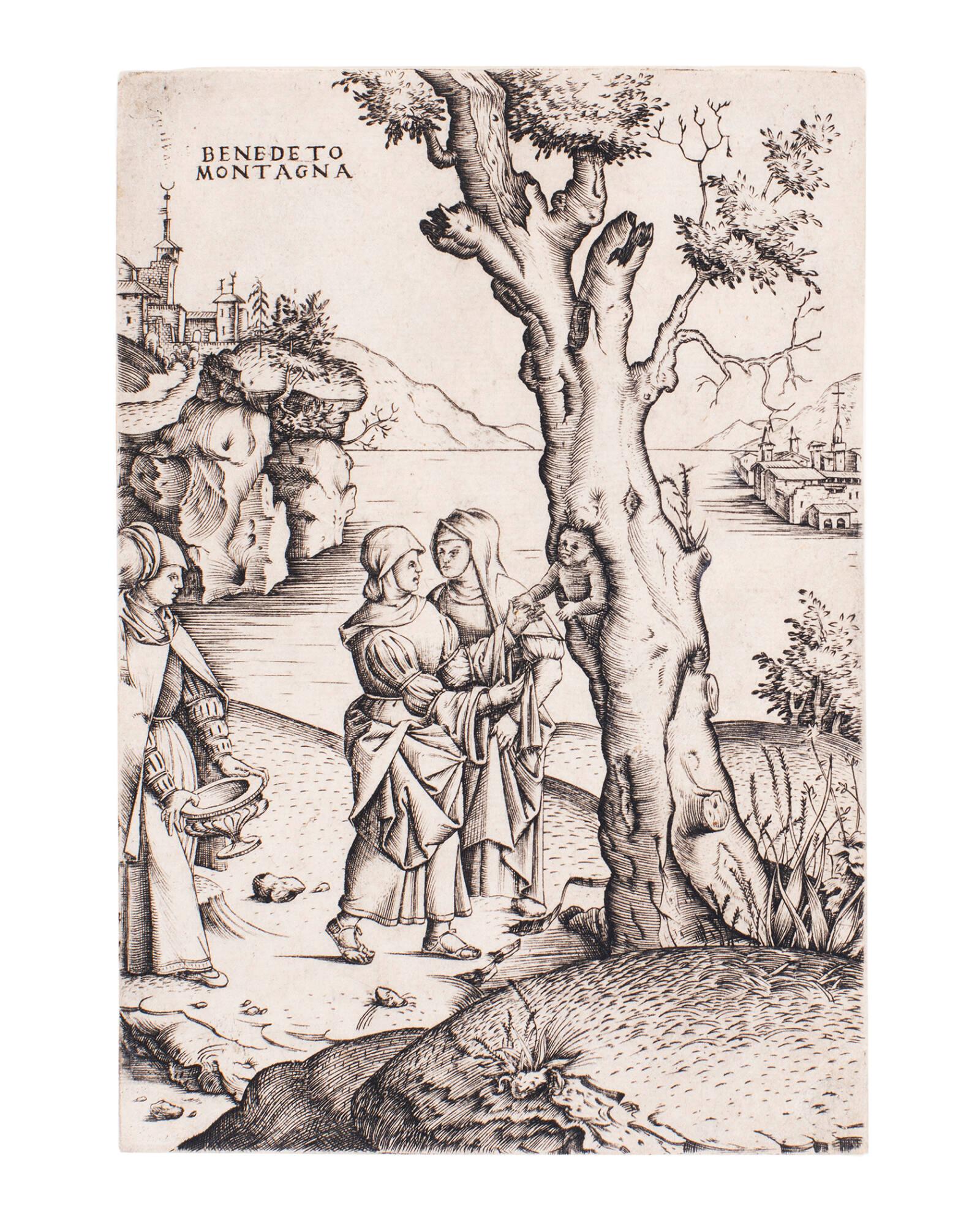 Trained by his father Bartolommeo, Benedetto Montagna was a painter and engraver. His pride in his work cannot be more plainly demonstrated than by the prominence given to his own name, placed in the midst of the empty sky. This reveals a willingness to intrude on the image for the sake of self-promotion.