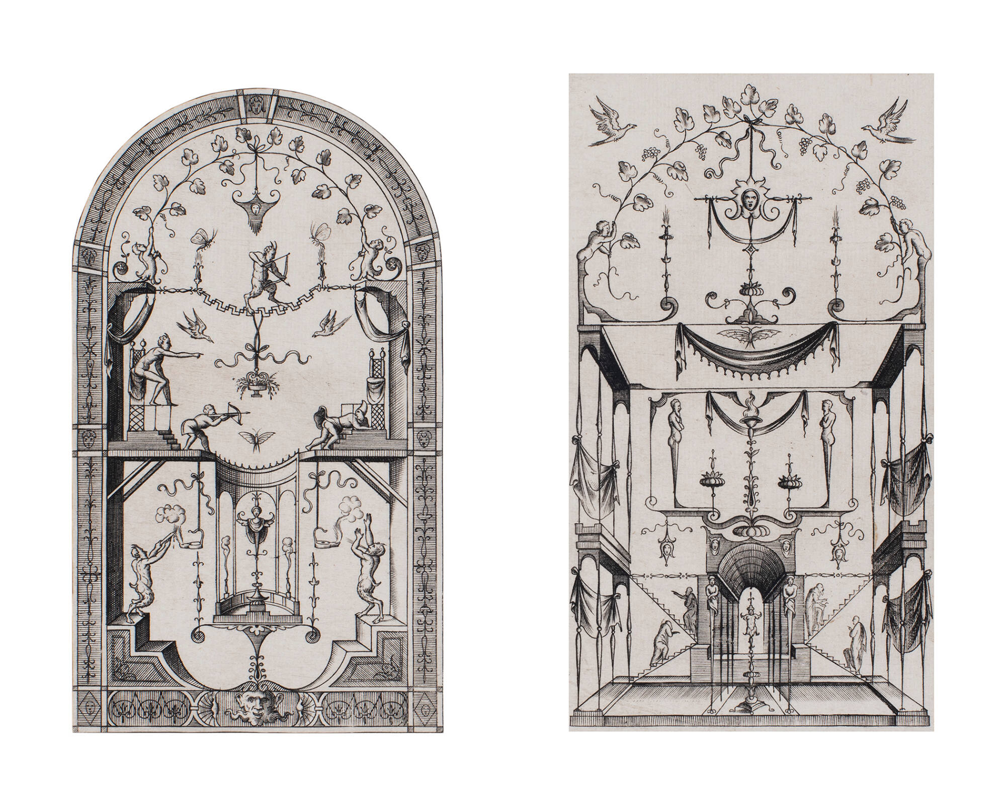 "Grotesque Panels" with Two Panels with Satyrs Fighting (left) and an Architectural Setting (right)