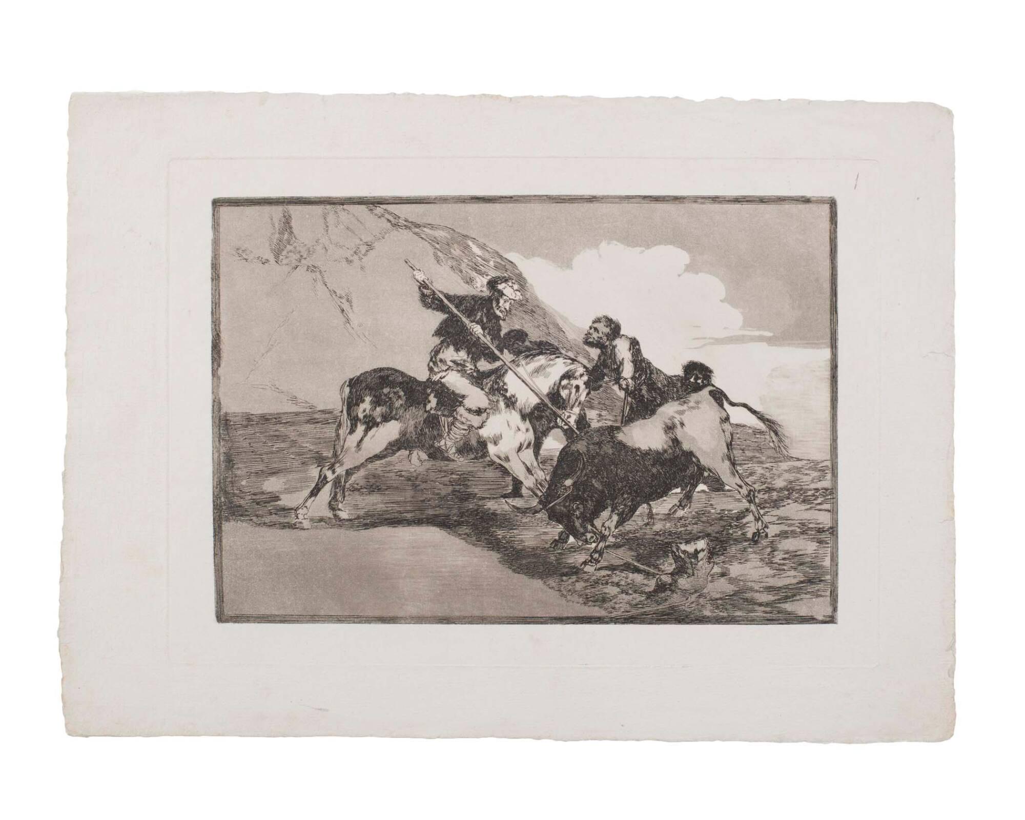 Modo con que los antiguos espanoles cazaban los toros a ballo en el campo. (The way ancient Spaniards baited the bull in the open) (From "Tauromachios" - No. 1)