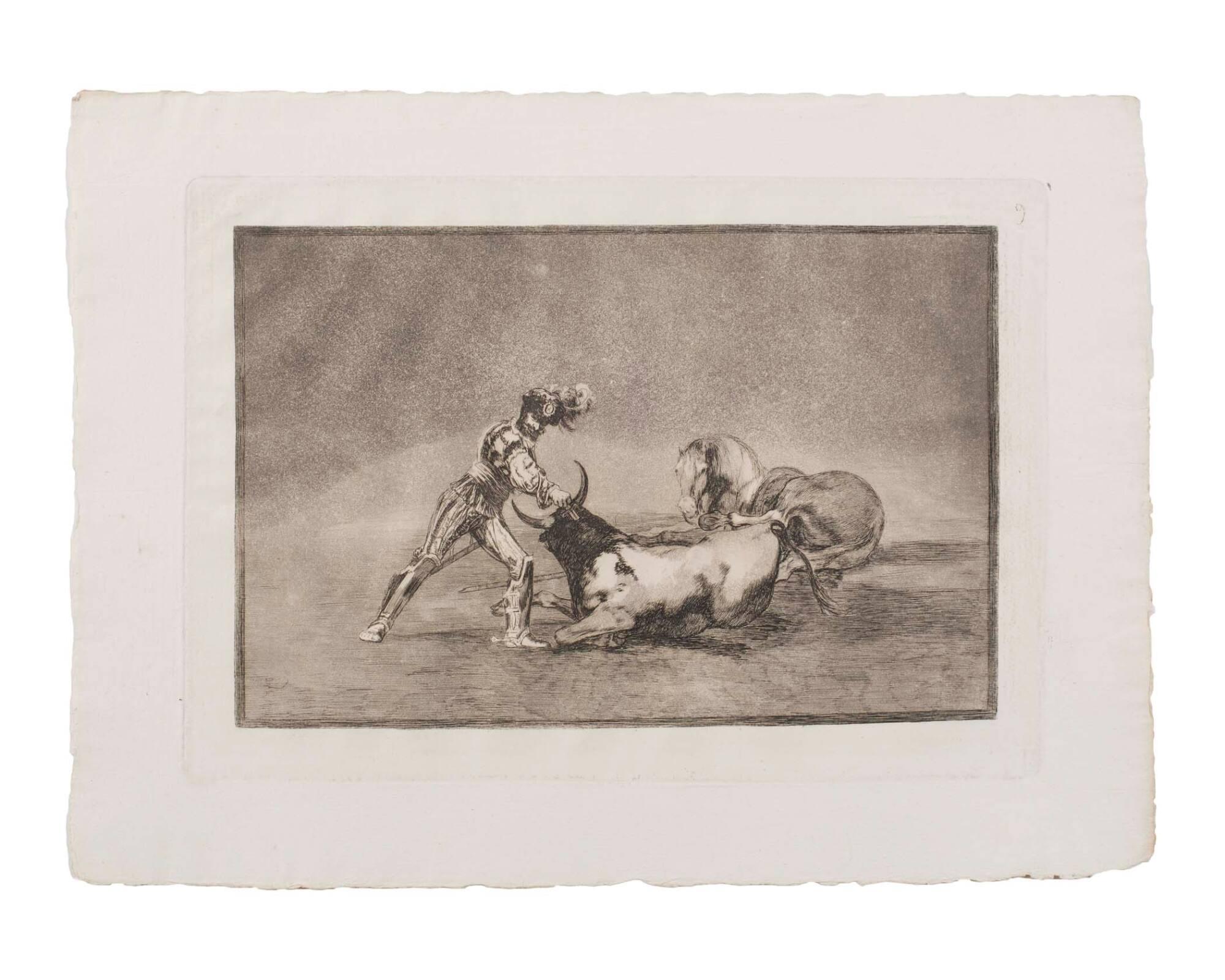Un caballero espanol mata un toro despues de haber perido el caballo. (A Spaniard kills the bull after losing his horse.) (From "Tauromachios" - No. 9)
