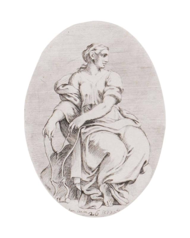 Moderation (seated female). (from Galeria nel Palazzo Farnese in Roma del Sereniss. Duca di Parma... dipinta da Annibale Carracci intagliata da Carlo Cesio.)