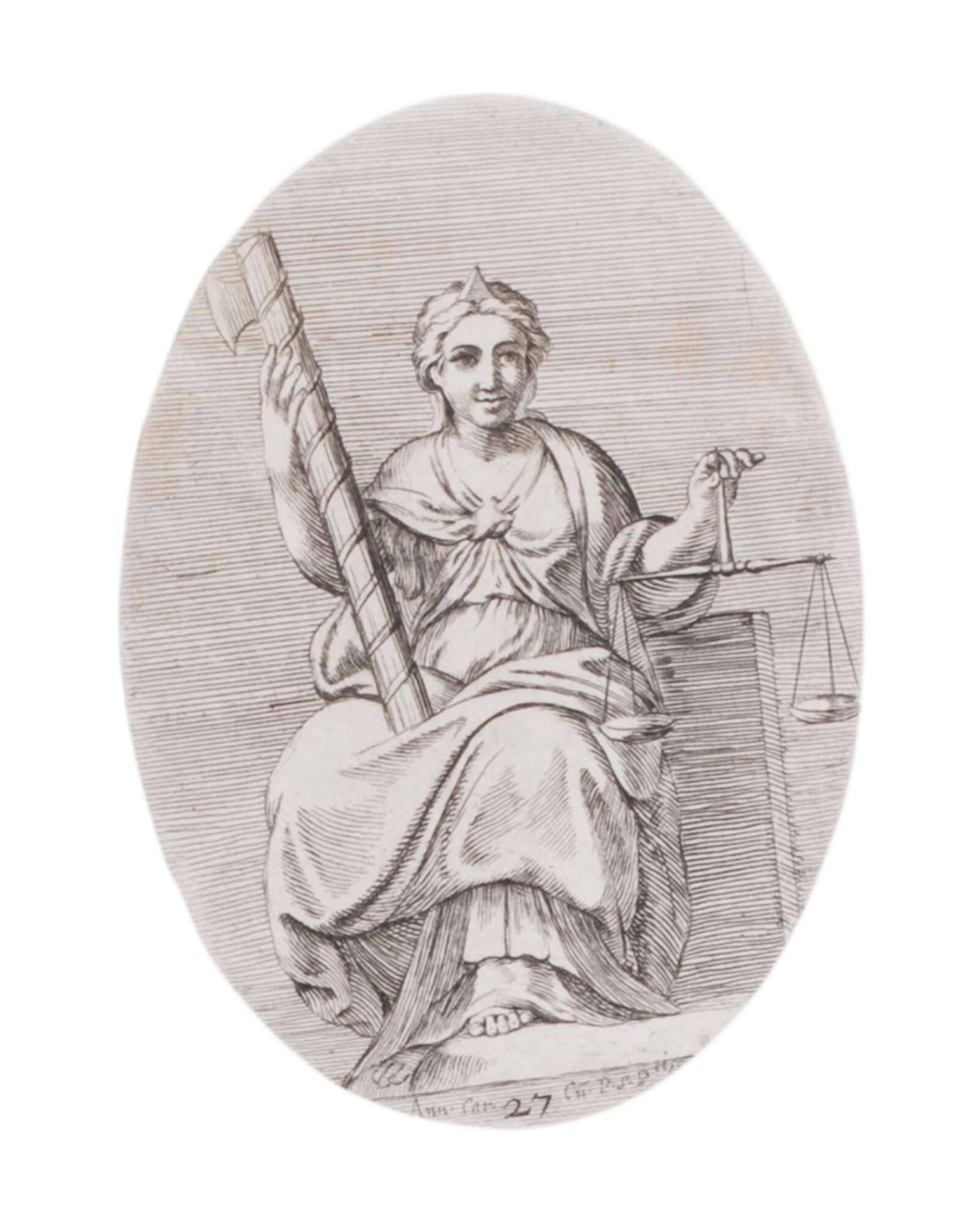 Justice (seated female). (from Galeria nel Palazzo Farnese in Roma del Sereniss. Duca di Parma... dipinta da Annibale Carracci intagliata da Carlo Cesio.)