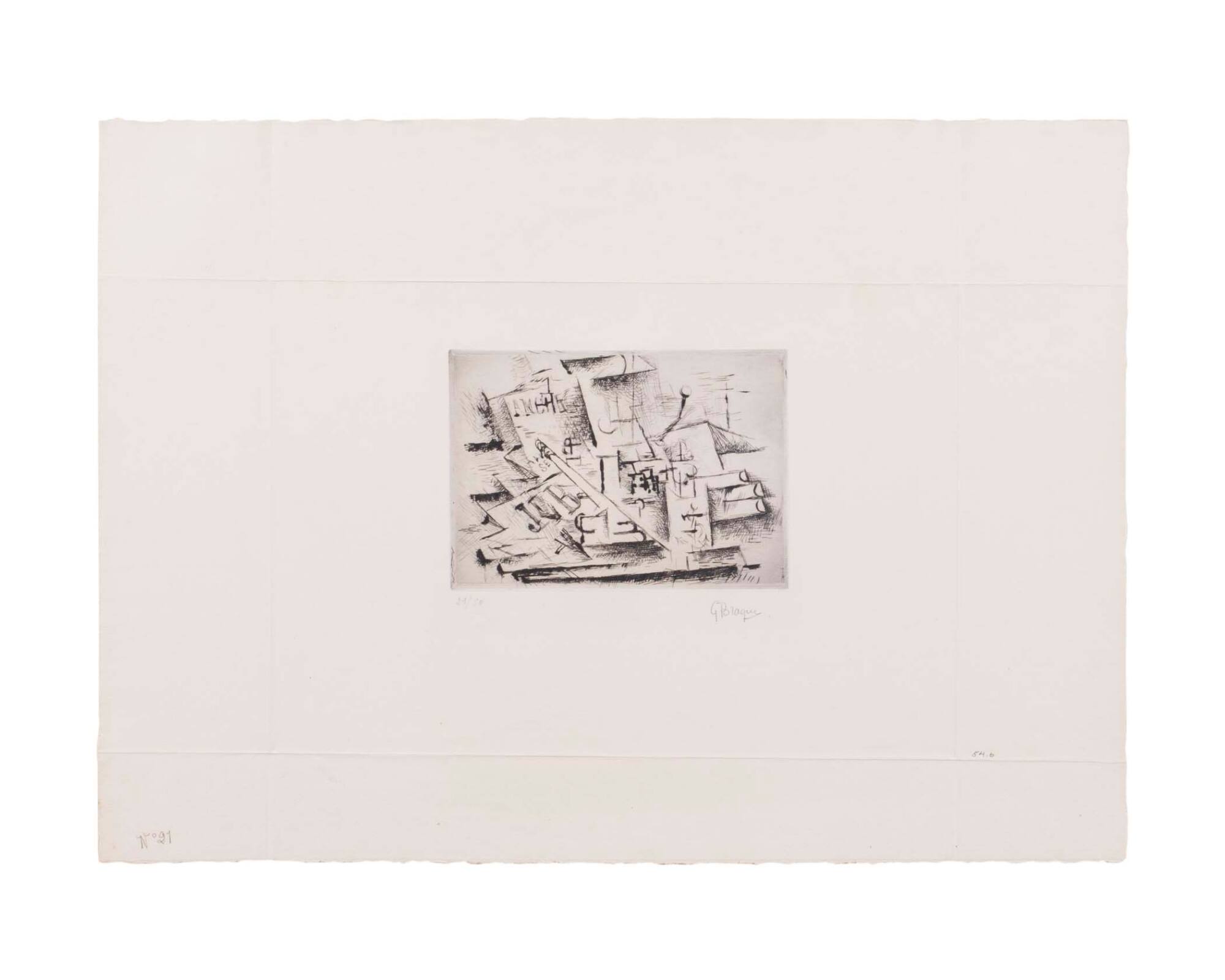 Label TextGeorges Braque and Pablo Picasso together developed a new and highly influential language of representation known as Cubism. In this café still -life, forms are fragmented and dispersed, light and shadow are placed at will to create relief and continuity, and space, as Braque proclaimed, is ‘materialized’. Links with reality are maintained through the inclusion of legible details: a nail with its shadow, a long-stemmed clay pipe, dice, an anchor-labeled package. Words and letters serve as seemingly informative complements: JOB, a brand of French cigarette paper and French slang for a deception; HAV, the letters of the seaport Le Havre, where Braque grew up; ANCHE, a fragment, perhaps, of the newspaper Le Journal du Dimanche. The result is highly ambiguous and tantalizingly elusive, a poetic “lyricism which stems entirely from the means employed,” as Braque wrote.Exhibition HistoryToledo Museum of Art, European Expressionist and Cubist Works on Paper: 1900-1930, December 2, 2011-March 11, 2012 (University of Toledo Student Exhibition). Toledo Museum of Art, Looks Good on Paper: Masterworks and Favorites, Oct. 10, 2014-Jan. 11, 2015.