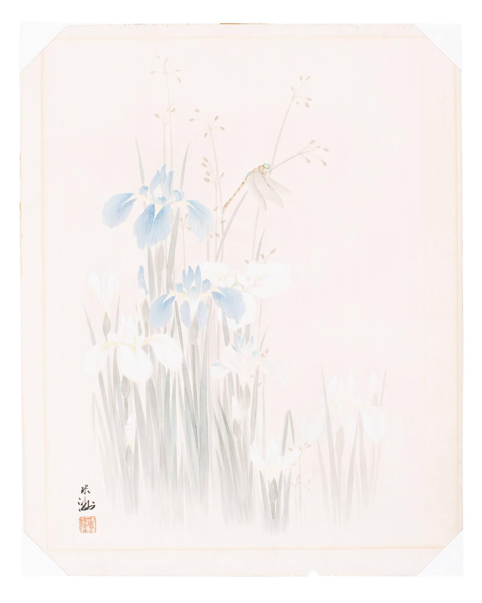 Blue and White Iris and Dragon Fly