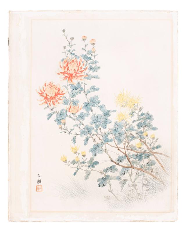 Chrysanthemums, Red and Yellow with gray-green leaves