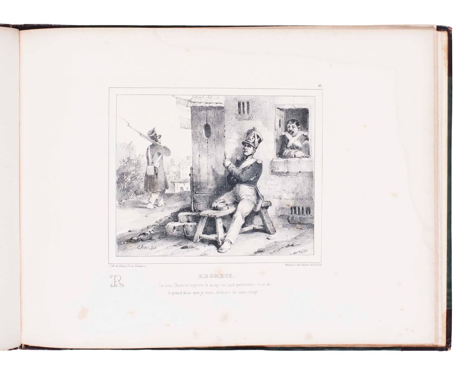 "R" (no. 18) "Regrets", Le bon Chauvin regrette la soupe au lard paternelle; se dit: A quand donc que je serai délibéré de mon congé?" from "Alphabet. Moral et Philosophique, à l’usage des petits et des grands enfans"
