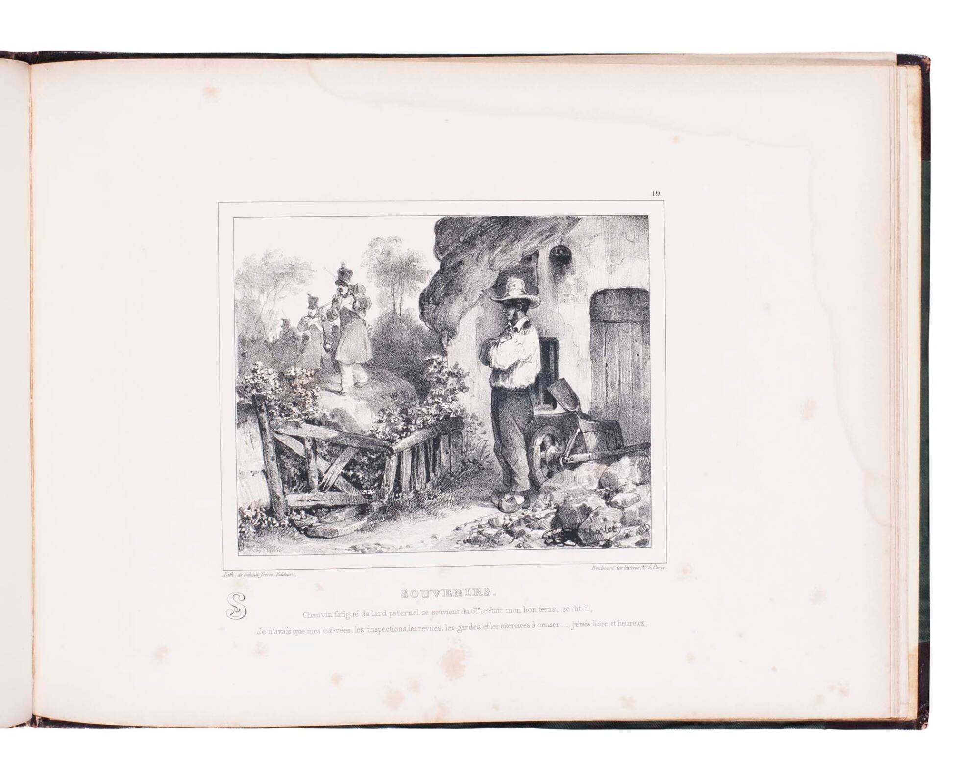 "S" (no. 19) "Souvenirs", Chauvin fatigué de lard paternel se souvient du 61e; c'était mon horteuse, se dit-il, Je n'avais que mes corvies, les inspection, les revues, les gardes te les exercises à penser . . .j étais libre et Heureaux."* from "Alphabet.