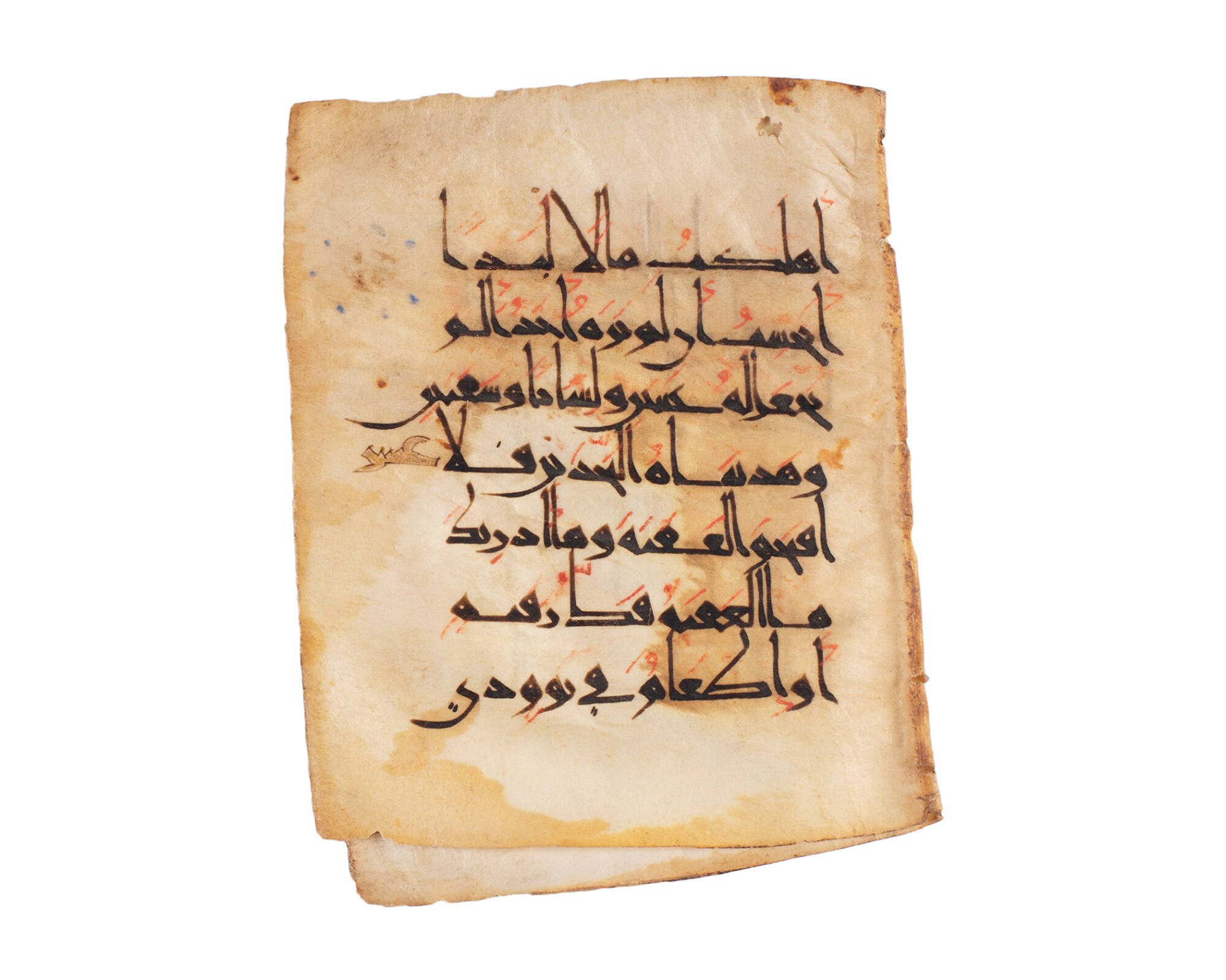 DescriptionA folded leaf from a Qur'an, two folios with seven lines of rugged eastern Kufic on each page. Gold chapter heading, diacritical marks in red. Sura Al-Balad (90: 6-14) and Surah Al-Qadr (97: 1-4). Eastern Kufic style; this style was developed and vastly used in Greater Khorasan (northeastern Iran) in the 10th and 11th centuries.