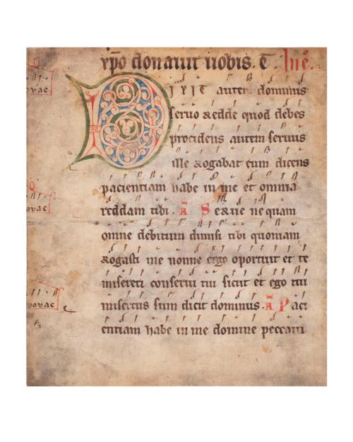 DescriptionOrnamented initial in red, blue, and green; rubrication in red.