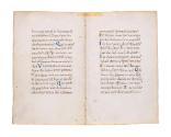 DescriptionThis bifolio contains 35 of the 42 statements comprising the Quicumque, the 6th century profession of Christian faith better known as the 'Athanasian Creed'. The text appears in four blocks of 15 lines each to be read in the following order: (1) omnipotens; (2) catholicam; (3) -quales; and (4) homo ex. While the wording of Quicumque is well established, this folio presents a very good model of the complex abbreviation techniques used by medieval scribes used before printing arrived in Europe in the mid-15th century. Gold and blue initials.