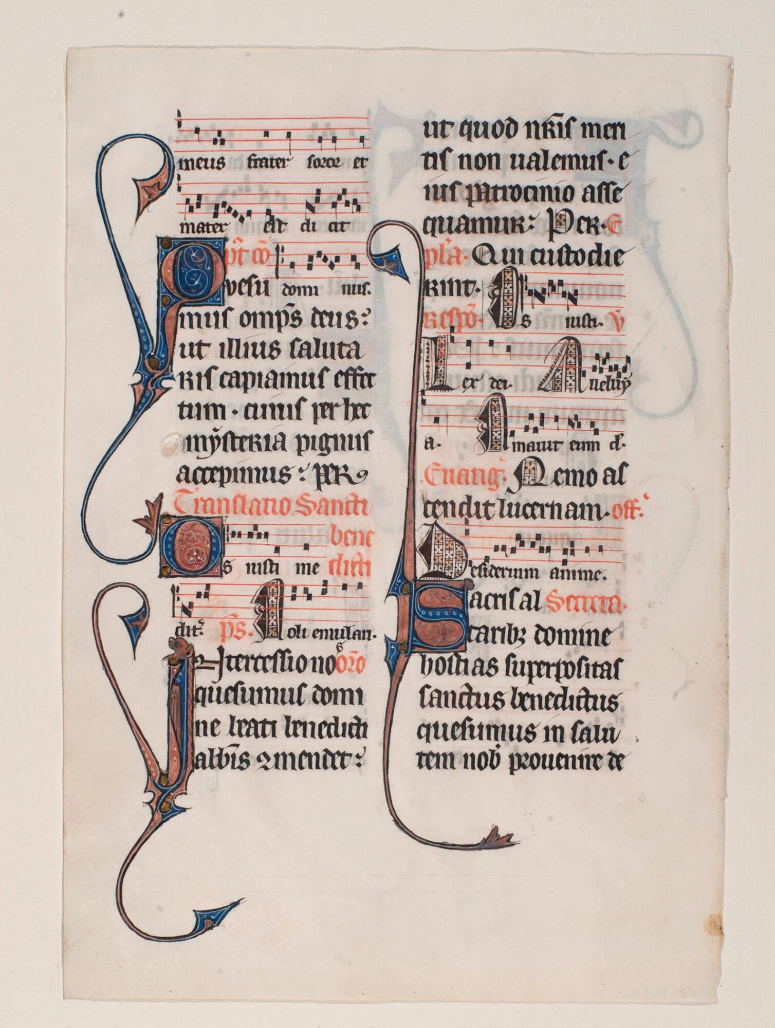 Label TextThis manuscript leaf was once part of a Missal (prayer book for Mass) that was a gift to a church in Beauvais, a principal European art center located outside of Paris. Although we often do not know who originally owned medieval books and manuscripts, in this instance information gathered from historical records points to a possible original owner: Robert de Hangest, a canon (cathedral priest) in Beauvais. Prior to the invention of the printing press in the mid-1400s, and in some cases after, books were handwritten on processed animal skins. This vellum (calf skin) page’s text is written in Latin using Transitional Gothic Script and is interspersed with musical notation. Sacred books like this Missal were frequently embellished to honor God. In addition to the text, the medieval scribe included ornamented initials that have long serpentine and leaf-like terminals to frame each column and smaller initials filled with quatrefoils (four-lobed shapes) to complement the music’s lyrics. Look for the animal head hidden within one of the decorated initials.Exhibition HistoryRemoved from exhibition on 4/29/2008. Should not be exhibited again until 2012.Mid 15th century